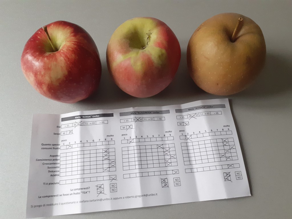 Three scab-resistant apples resulting from conventional breeding at the University of Bologna in Italy. I got them yesterday from prof. Stefano Tartarini at a workshop on NBTs (New Breeding Techniques, also called TEA in Italy, meaning Assisted Evolution Techniques). I filled out the evaluation questionnaire on the red, the pink, and the rusty apple. The last question is: would you buy it if it was a TEA fruit? A big yes from me! (My favorite is the rusty one).